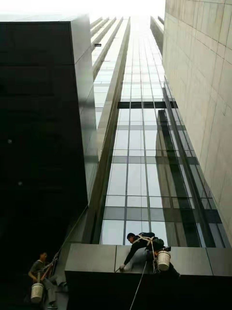 二、高空外墙玻璃清洗:1、外墙清洗施工工具:高空高空缆绳、保险绳、安全带、电泵式高压水枪、吊板、钢制U型蟹扣、自锁器、安全带、水桶、喷壶、铲刀、玻璃刮洗器等相关材料及其它配套工具。2、外墙清洗使用清洁剂:全能水、中性清洁剂、明亮玻璃清洁剂等。3、外墙清洗方式:吊板和擦窗方式。4、楼顶设立人员做安全保护。5、楼底设巡视安全保护人员。