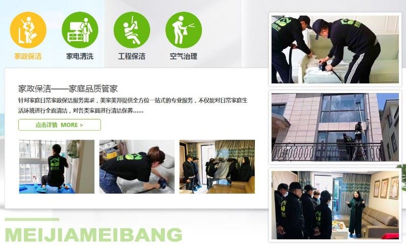 专注于日常保洁、家庭保洁、开荒保洁、物业保洁、玻璃清洗、空调清洗、地毯清洗、沙发清洗、油烟机清洗、外墙清洗、地板打蜡、石材翻新、水晶灯清洗、杀虫灭鼠、壁纸清洗、空气净化、甲醛检测与治理、空气检测、高空清洗、地暖清洗、冰箱清洗、洗衣机清洗、饮水机清洗、热水器清洗等服务。