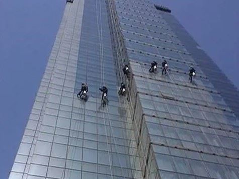 外墙清洗操作流程:1、操作前,必须了解天气情况、勘察施工现场、准备必需的工(器)具,施工人员穿戴好劳保服饰;安全监督员到达现场(安排两人:楼顶及地面各一人),放置高空作业指示牌。2、操作时,先在楼顶平台选择牢固地点(如管道等)作为固定栓绳索的地方(主、副绳固定点要分开),检查所有绳索在搭角、搭棱、搭檐的地方是否已用橡胶或地毯块垫底(防止磨擦)。3、将主绳在坐板上的U型卸扣里打好一个特殊的结,操作人员按规定系好安全带,将自锁器单独悬挂于安全绳上;带上施工吊桶、玻璃刮洗器、抹水器及抹布等,由安全员彻底检查通过后,方可缓慢将绳索松放工作。4、清洗结束后,操作人员应将主绳、安全绳等收齐、整理好,并检查破损情况。如发现绳索破损,应及时汇报、视情处理;将其他工具擦拭干净等。5、做好当班工作记录,并经安全员和领班签字,汇报经理后,方可完工、离岗。