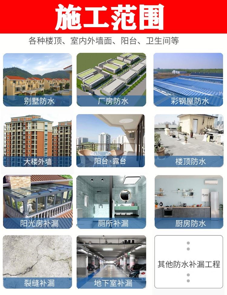 本中心以质量作为企业的生命,我们拥有一批高、中级技术职称的专业技术人员和管理人员,配有先进的堵漏防水施工机械设备。多年来积累了丰富的施工经验,在堵漏工艺方面采用当前国内外较先进的高压注浆技术。总结了一整套传统与现代工艺相结合的堵漏防水的方法,能针对不同情况正确选材合理施工,达到彻底止水之目的;更擅长疑难渗漏的修补,防水堵漏治标又治本,免除旧屋面不断翻新之苦及家中漏水之愁!服务项目:1.专业承接卫生间不砸砖防水,技术成熟可靠,省去传统砸砖防水的污染及干扰,省时省力,环保安全,施工快捷,24个小时完工,30年保修。2.专业承接屋面防水、楼顶防水、地下室防水等工程。3.接各种新旧屋面、彩钢房、地下室、地铁、电梯井、冷库防水、防潮、抗渗堵漏等各种堵漏工程。4.承接桥梁、道路、隧道、养鱼池、游泳池、浴池、居民楼、办公楼、厂房、库房、民房等建筑物的防水防腐地坪施工及维修。5.环氧高压注浆及嵌缝结构修补。