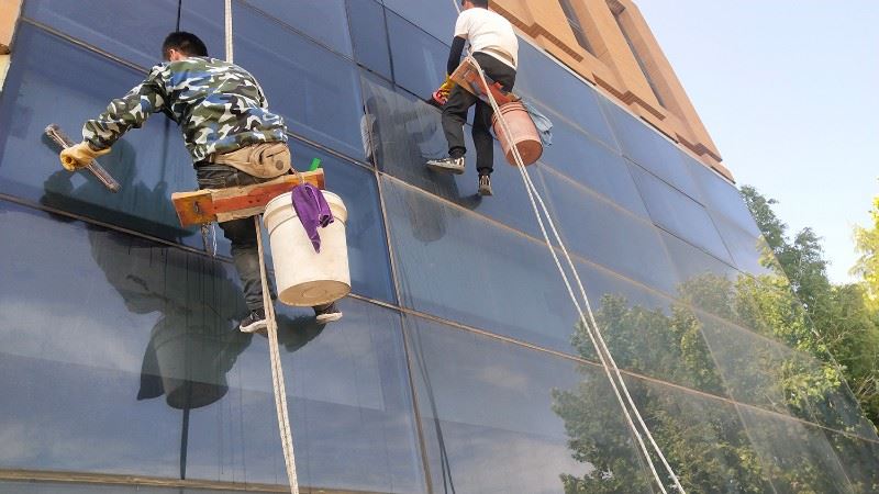 二、高空外墙玻璃清洗:1、外墙清洗施工工具:高空高空缆绳、保险绳、安全带、电泵式高压水枪、吊板、钢制U型蟹扣、自锁器、安全带、水桶、喷壶、铲刀、玻璃刮洗器等相关材料及其它配套工具。2、外墙清洗使用清洁剂:全能水、中性清洁剂、明亮玻璃清洁剂等。3、外墙清洗方式:吊板和擦窗方式。4、楼顶设立人员做安全保护。5、楼底设巡视安全保护人员。
